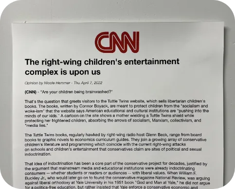 Un artículo de CNN acusó a los Mellizos Tuttle de crear un «complejo educativo infantil de derecha» para combatir la adoctrinación liberal de los niños, a raíz de los libros sobre raza, género e ideología que se están imponiendo como propaganda a los niños en las escuelas de todo el país. El artículo atacó nuestro trabajo e intentó desacreditar su propósito.
